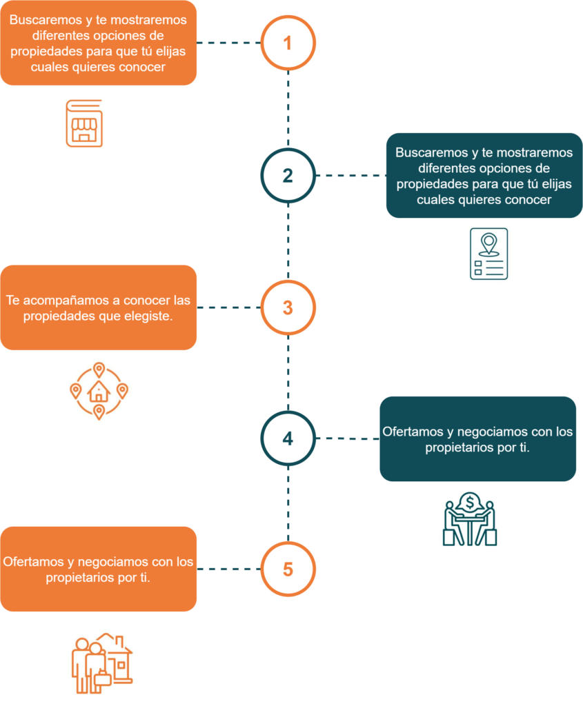 BÚSQUEDAS PERSONALIZADAS ESTO SERÁ LO QUE HAREMOS POR TI Buscaremos y te mostraremos diferentes opciones de propiedades para que tú elijas cuales quieres conocer ---------- 1 2 ---------- Organizamos el itinerario de las visitas en función a tu agenda Te acompañamos a conocer las propiedades que elegiste. ---------- 3 4 ---------- Ofertamos y negociamos con los propietarios por ti. Ofertamos y negociamos con los propietarios por ti. ---------- 5 Al seleccionar el botón "OBTENER SERVICIO" se abrirá un formulario OBTENER SERVICIO