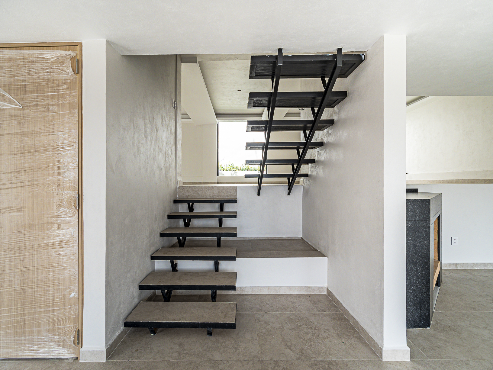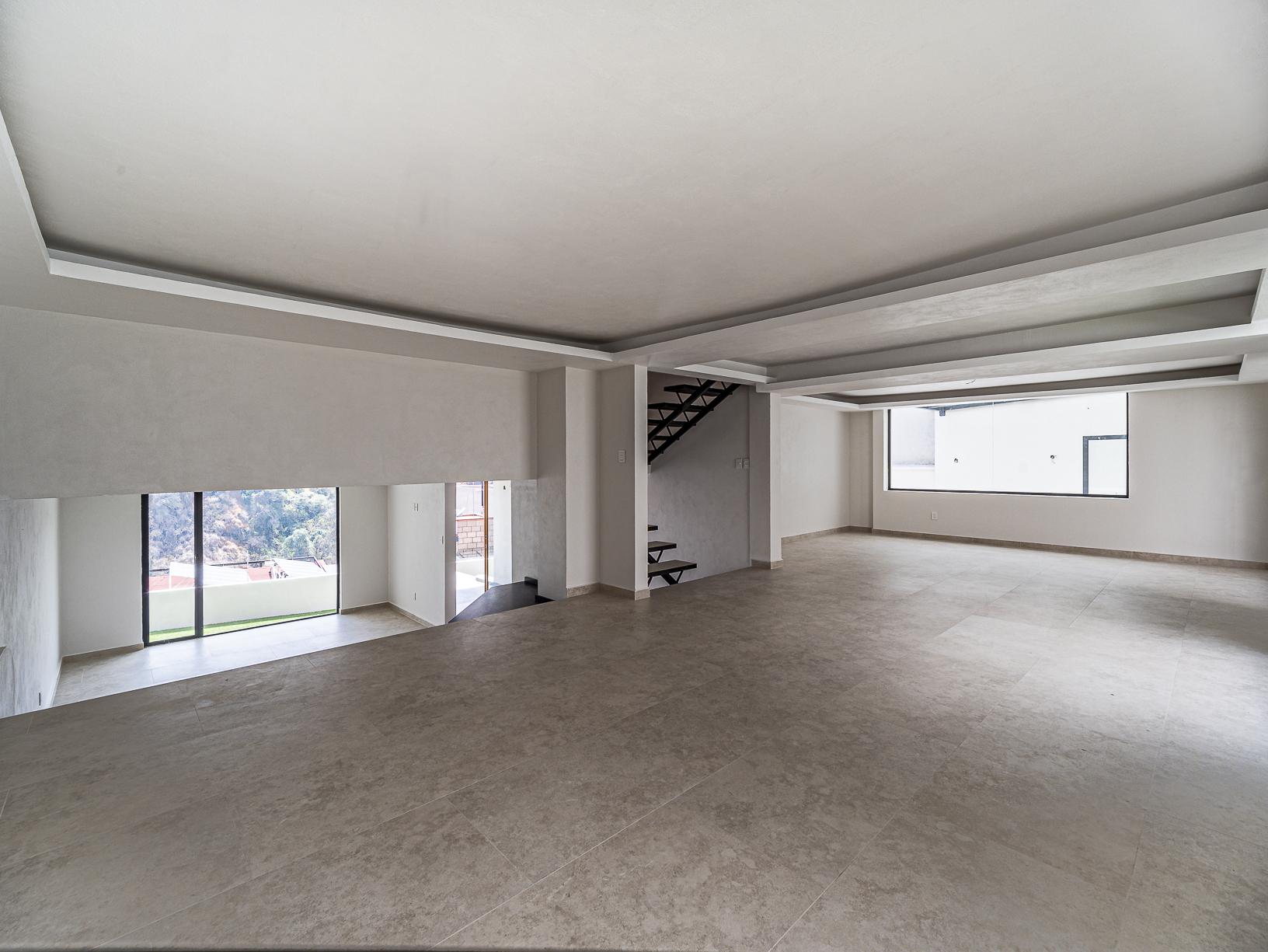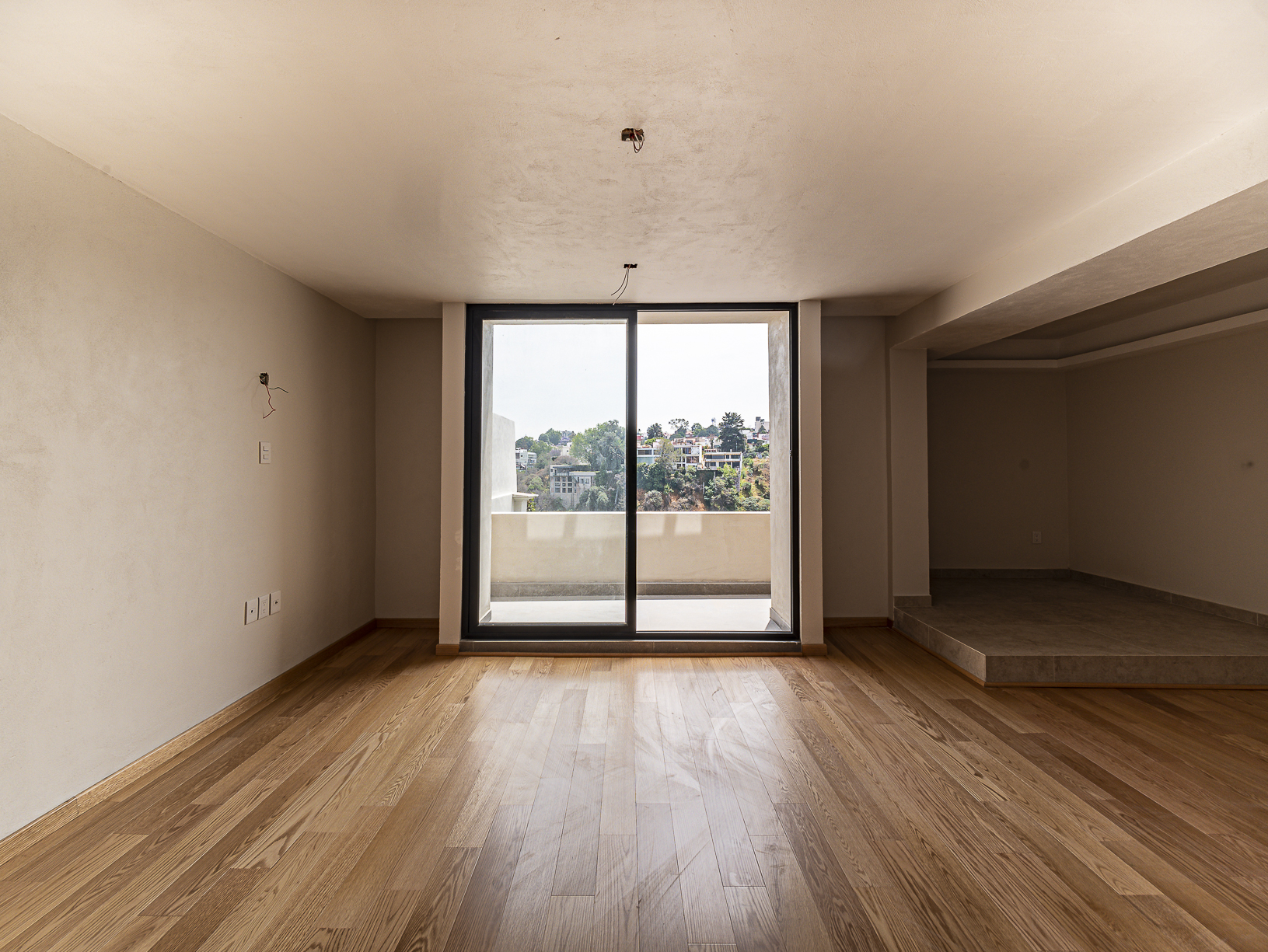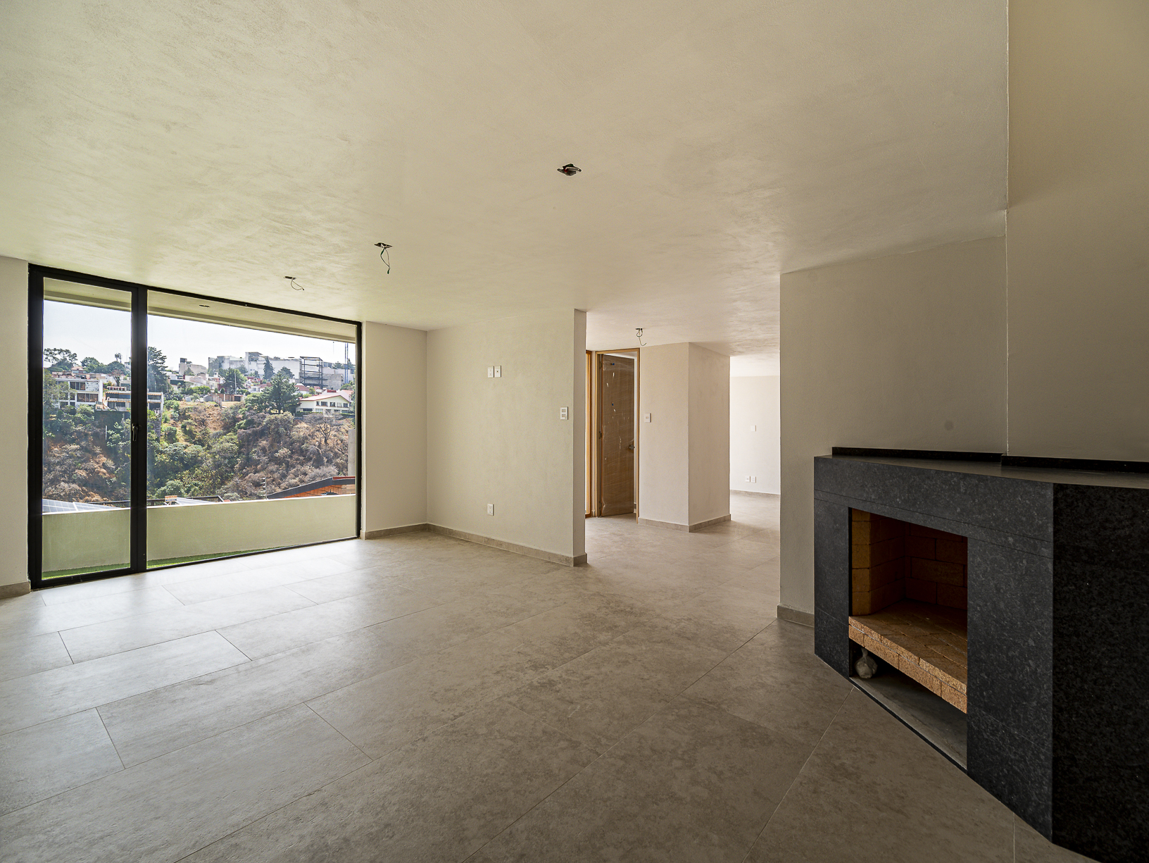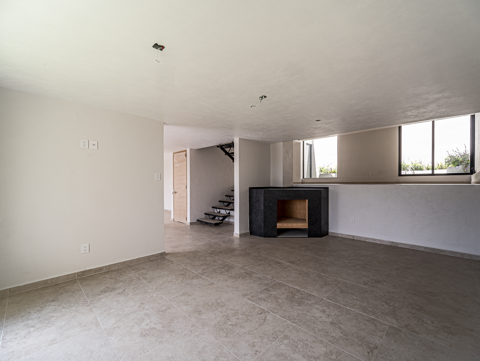 En el primero de ellos encontramos un pequeño espacio que bien puede ser un recibidor, y al otro costado, en el mismo piso, otro gran espacio con una bella chimenea de fondo ideal para una linda sala. Justo en el siguiente nivel encontramos todo el espacio del piso destinado a la estancia, con una preciosa vista a la primer terraza.
