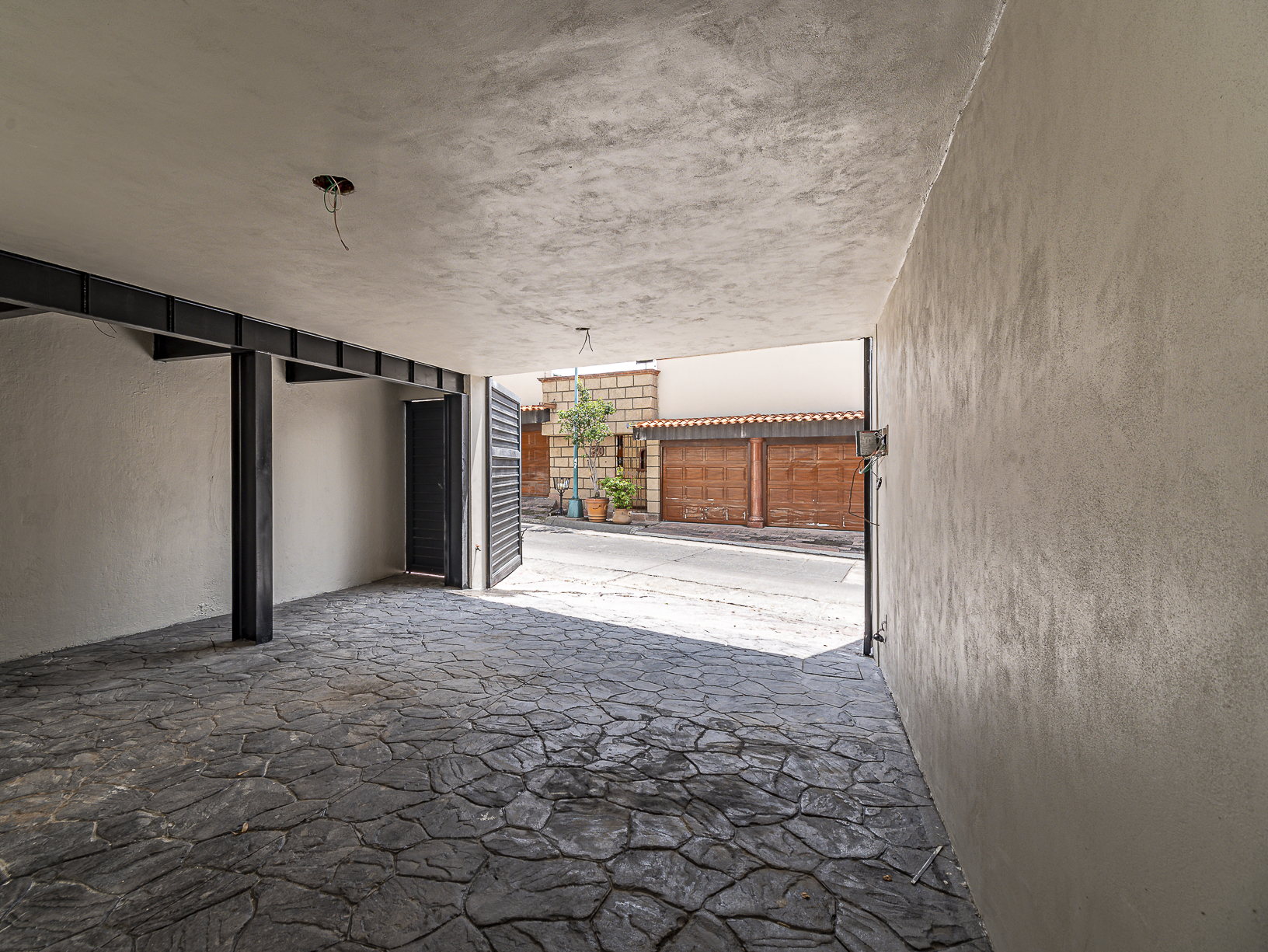 La casa cuenta con un garaje con espacio para dos autos medianos y uno pequeño.